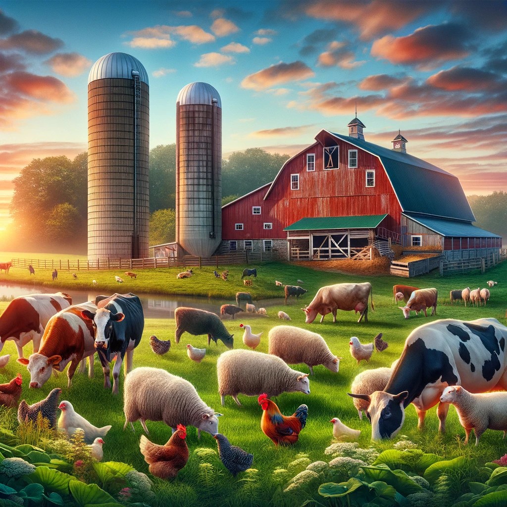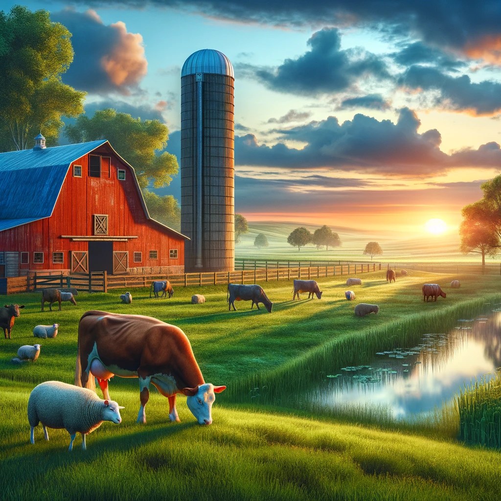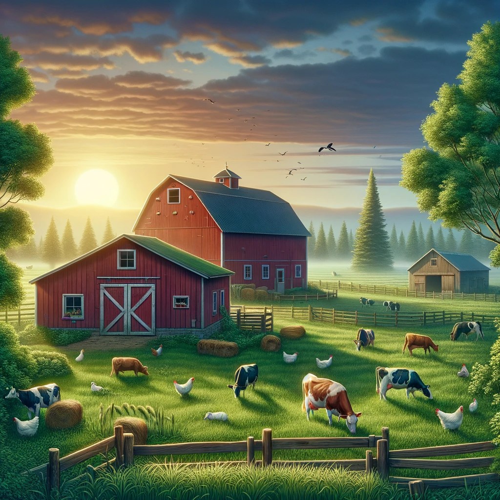 ChatGPT: Here’s the image of a farm scene at sunrise, complete with a variety of farm animals, a classic red barn, and a picturesque landscape. I hope you find it captures the serene and idyllic essence of rural life!